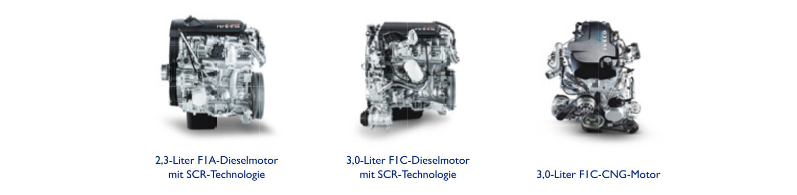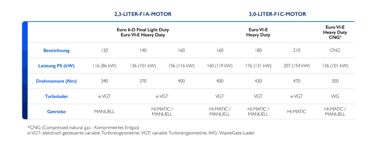 - 3,0-Liter-Motor mit 3 verschiedenen Leistungsstufen von 160 bis 207 PS und einem Drehmoment von bis zu 470 Nm (auch als Compressed-Natural-Gas-Version erhältlich)
