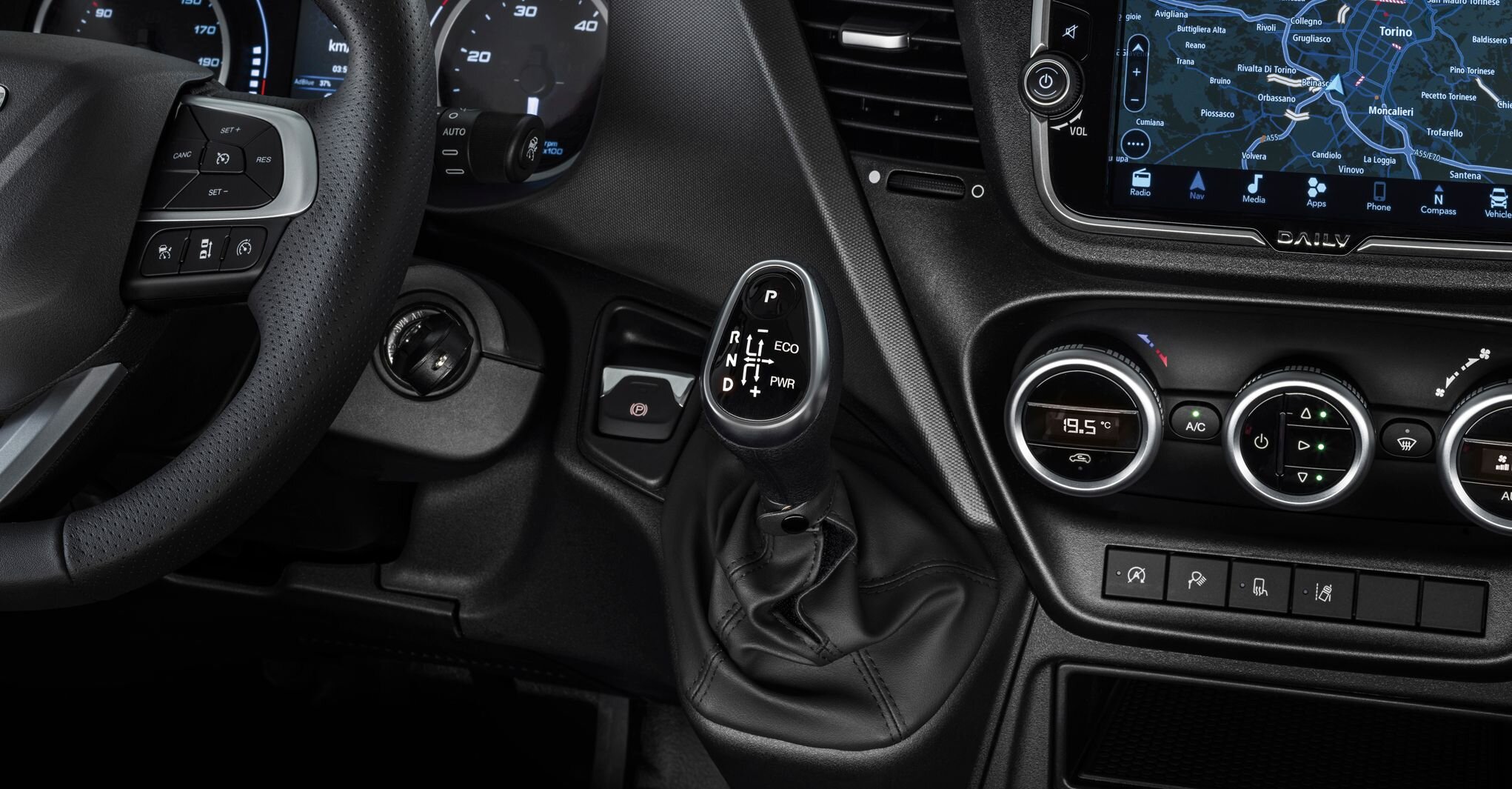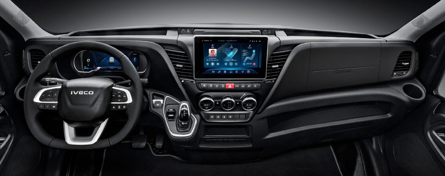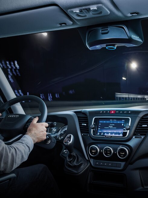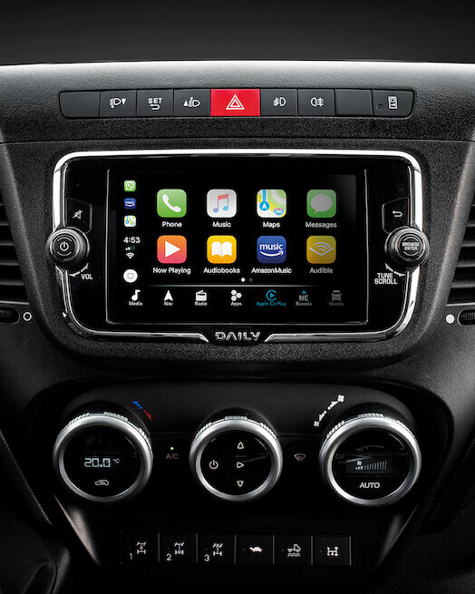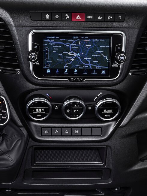 Der Daily hebt sich durch sein serienmäßiges 10 Zoll großes Kombi-Instrument von der Masse ab. Die Informationen zum Fahrzeug werden übersichtlich und in großer Schrift auf dem Breitbild-Display dargestellt. Fahrer haben die Wahl zwischen drei Designs, die sich per Schalter ganz einfach umstellen lassen. Bei Modellen ohne Infotainment oder DAB Radio wird die Ansicht der Rückfahrkamera angezeigt, wenn der Rückwärtsgang eingelegt wird.