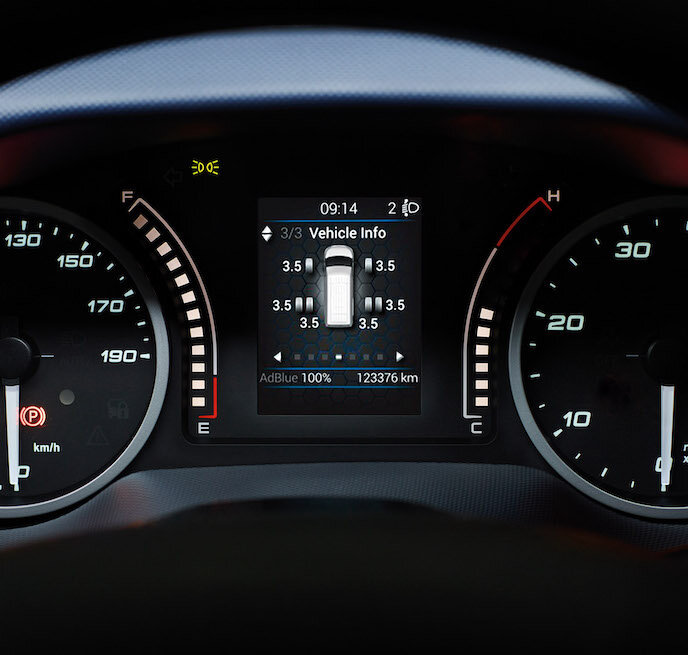 Die Reifendruckdaten werden direkt auf dem Kombiinstrument angezeigt, damit Sie stets den optimalen Reifendruck aufrechterhalten können. Dies gewährleistet sicheres Fahren und hilft, Kraftstoff zu sparen – verfügbar für Modelle mit Einzel- oder Zwillingsbereifung. Sicherheit und Effizienz, immer im Blick.