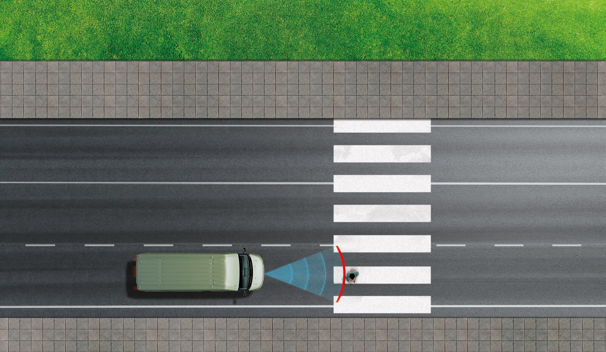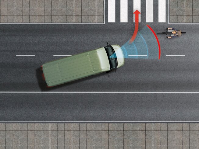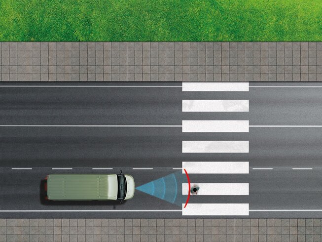 Das System reagiert auf zugelassene Fahrzeuge und gefährdete Verkehrsteilnehmer. Es verhindert Kollisionen mit langsamen Fußgängern und Radfahrern.
