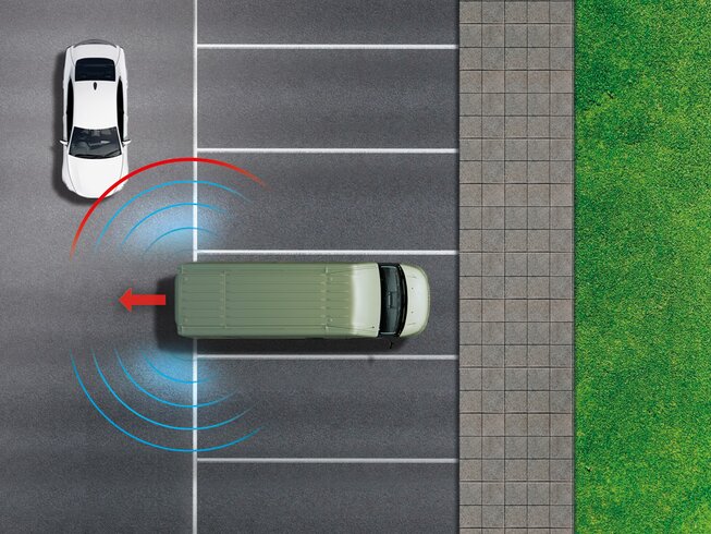 Diese Funktion ermöglicht ein einfaches und sicheres Zurücksetzen des Fahrzeugs. Sie erhalten Informationen zu Fahrzeugen und Hindernissen in der Umgebung und es ertönt ein Warnsignal, wenn Sie zu dicht heranfahren. Bei Bedarf wird ein automatischer Bremsvorgang eingeleitet, um eine Kollision zu vermeiden.