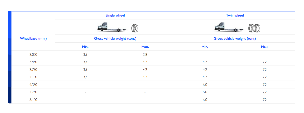 Die Fahrgestelllösung ermöglicht die Installation von 1, 2, 3 oder 4 Batterien (bis zu 4 Batteriemodule), ohne das ein Element über den Rahmen hinausragt. Das ist ideal für die Installation von Aufbauten auf dem Fahrgestell und ermöglicht eine Ladekapazität von bis zu 20 m³ beim Kastenwagen.
